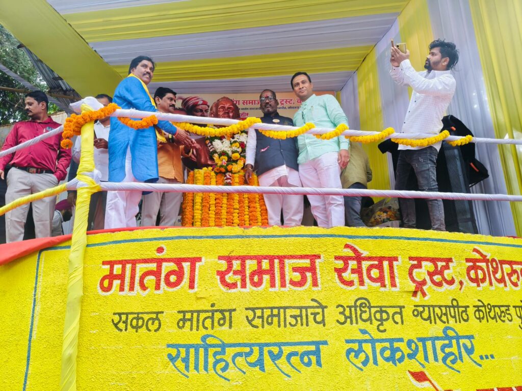 पुणे : साहित्यरत्न लोकशाहीर अण्णाभाऊ साठे यांची जयंती मोठ्या उत्साहात आणि अभिमानाने सारसबाग, पुणे येथे साजरी करण्यात आली. मातंग समाज सेवा ट्रस्ट, कोथरूड यांच्या वतीने आयोजित या भव्य कार्यक्रमात अण्णाभाऊ साठे यांच्या प्रतिमेस पुष्पहार अर्पण करून अभिवादन करण्यात आले.कार्यक्रमाला भाजपा कॅन्टोन्मेंटचे आमदार सुनील कांबळे, रिपब्लिकन पक्षाचे महाराष्ट्र प्रदेश नेते परशुराम वाडेकर, बाळासाहेब जानराव, दलित स्वयंसेवक संघाच्या लक्ष्मीताई पवार, भाजपाचे पुणे शहर नेते संदीप बुटाला, निलेश कोंढाळकर, भगीरथ नामा वृत्तपत्र समूहाचे संपादक दिपक सगर, आरपीआयचे वरिष्ठ उपाध्यक्ष जितेश दामोदरे, पत्रकार विशाल सरवदे तसेच साहित्यरत्न अण्णाभाऊ साठे पुतळा समितीचे अध्यक्ष विजय डाकले यांच्यासह अनेक मान्यवर उपस्थित होते.