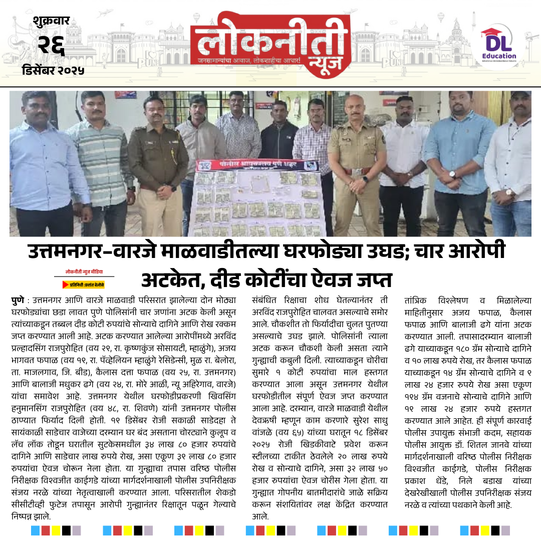 All content, images, and materials published on Lokniti News are provided for general information and public awareness purposes only. While every effort is made to ensure accuracy and authenticity, Lokniti News does not make any warranties, express or implied, regarding the completeness, reliability, or accuracy of the information. All images, videos, and other media used on this website are either created by Lokniti News, used with permission, or believed to be in the public domain. If any copyrighted material has been used inadvertently, it is purely unintentional. The concerned copyright owner may contact us for correction or removal. Unauthorized use, reproduction, or distribution of any content from this website is strictly prohibited and may invite legal action under the Indian Copyright Act, 1957. By accessing this website, you agree that any disputes arising out of or related to its use shall be subject to the exclusive jurisdiction of the courts at Pune, Maharashtra, India. © 2025 Lokniti News. All Rights Reserved.