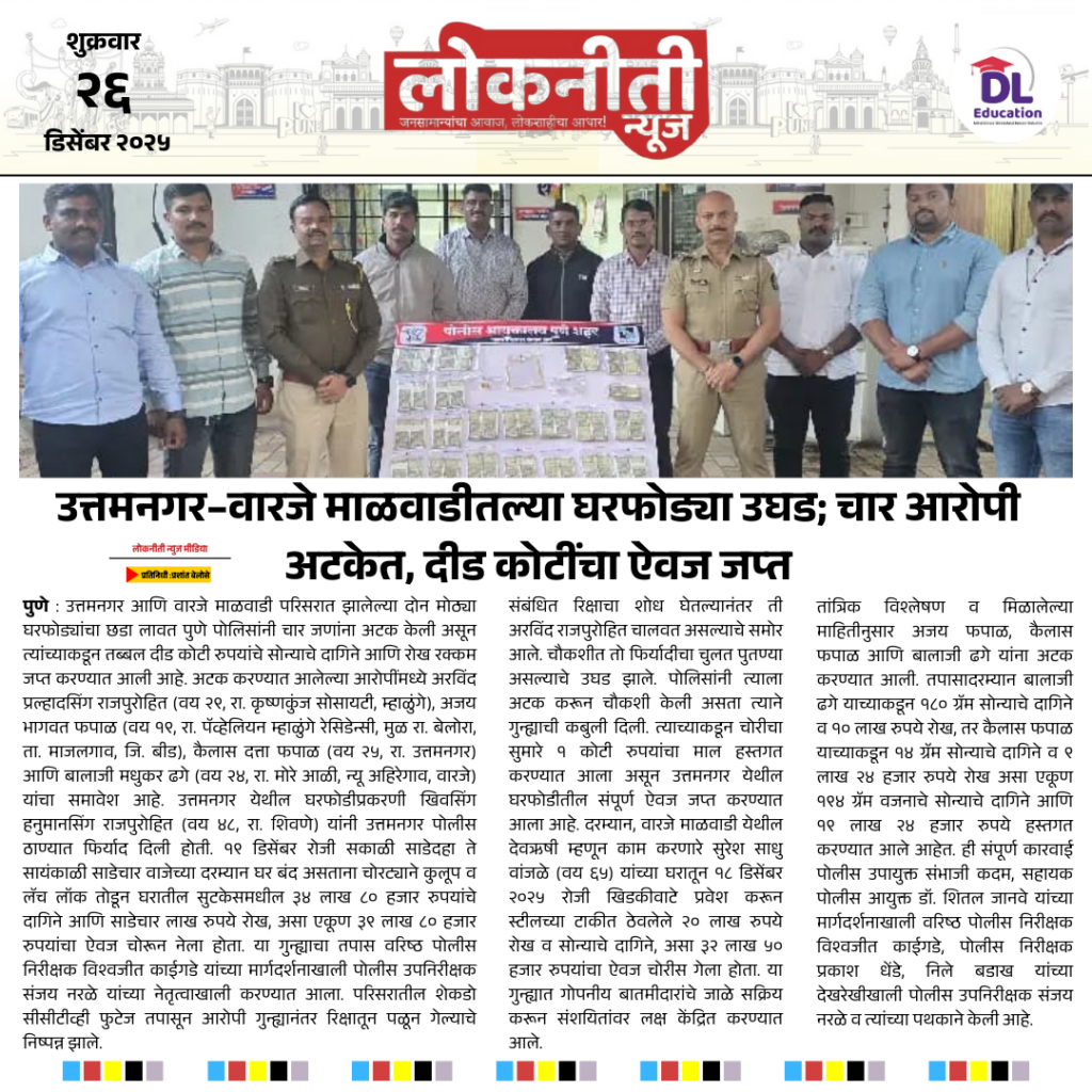 उत्तमनगर–वारजे माळवाडीतल्या घरफोड्या उघड; चार आरोपी अटकेत, दीड कोटींचा ऐवज जप्त.