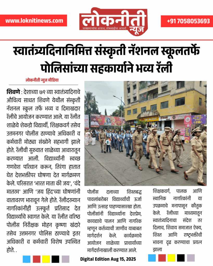 संस्कृती नॅशनल स्कूलतर्फे स्वातंत्र्यदिन रॅलीत देशभक्तीचा जल्लोष