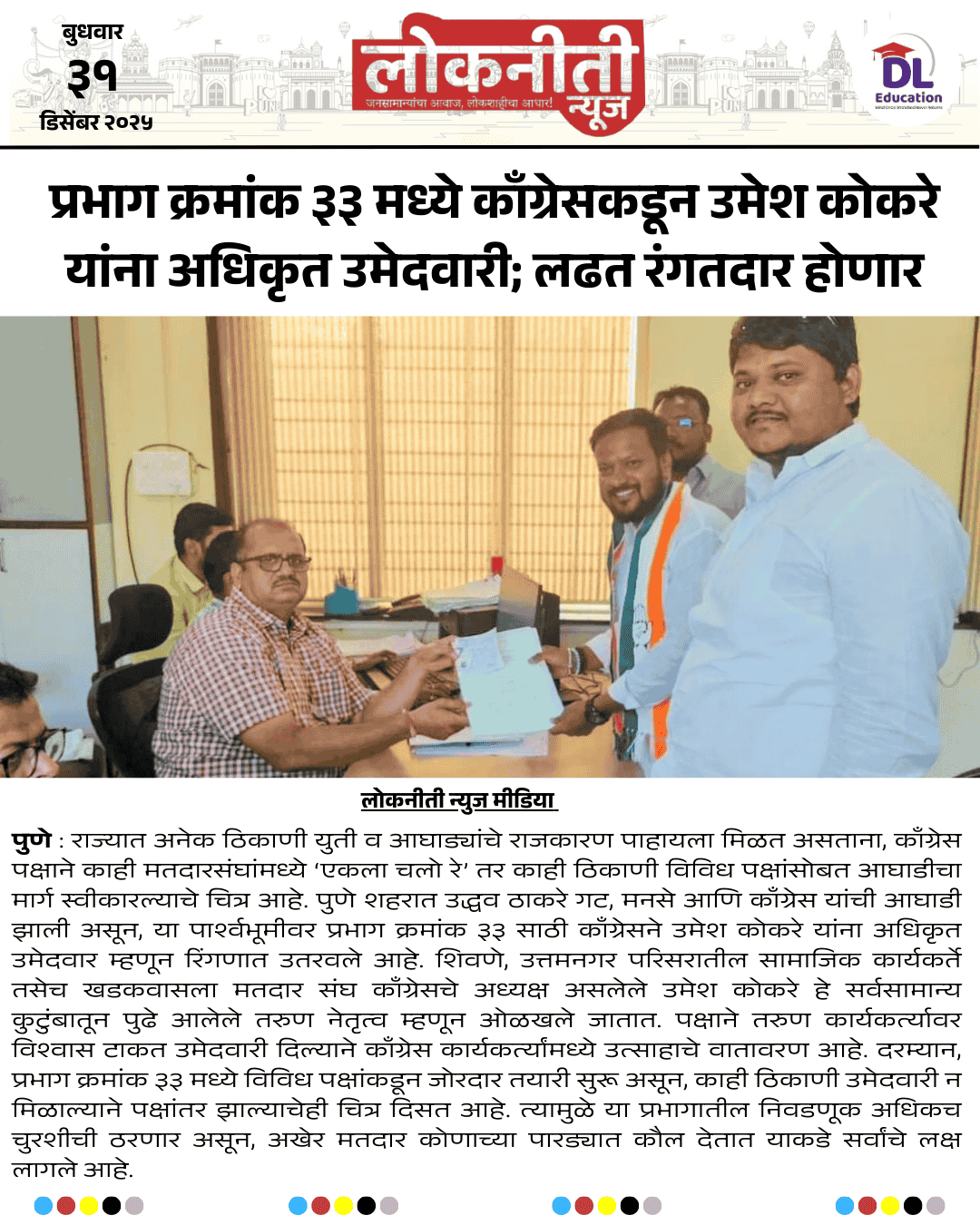 प्रभाग क्रमांक ३३ मध्ये काँग्रेसकडून उमेश कोकरे यांना अधिकृत उमेदवारी; लढत रंगतदार होणार.
