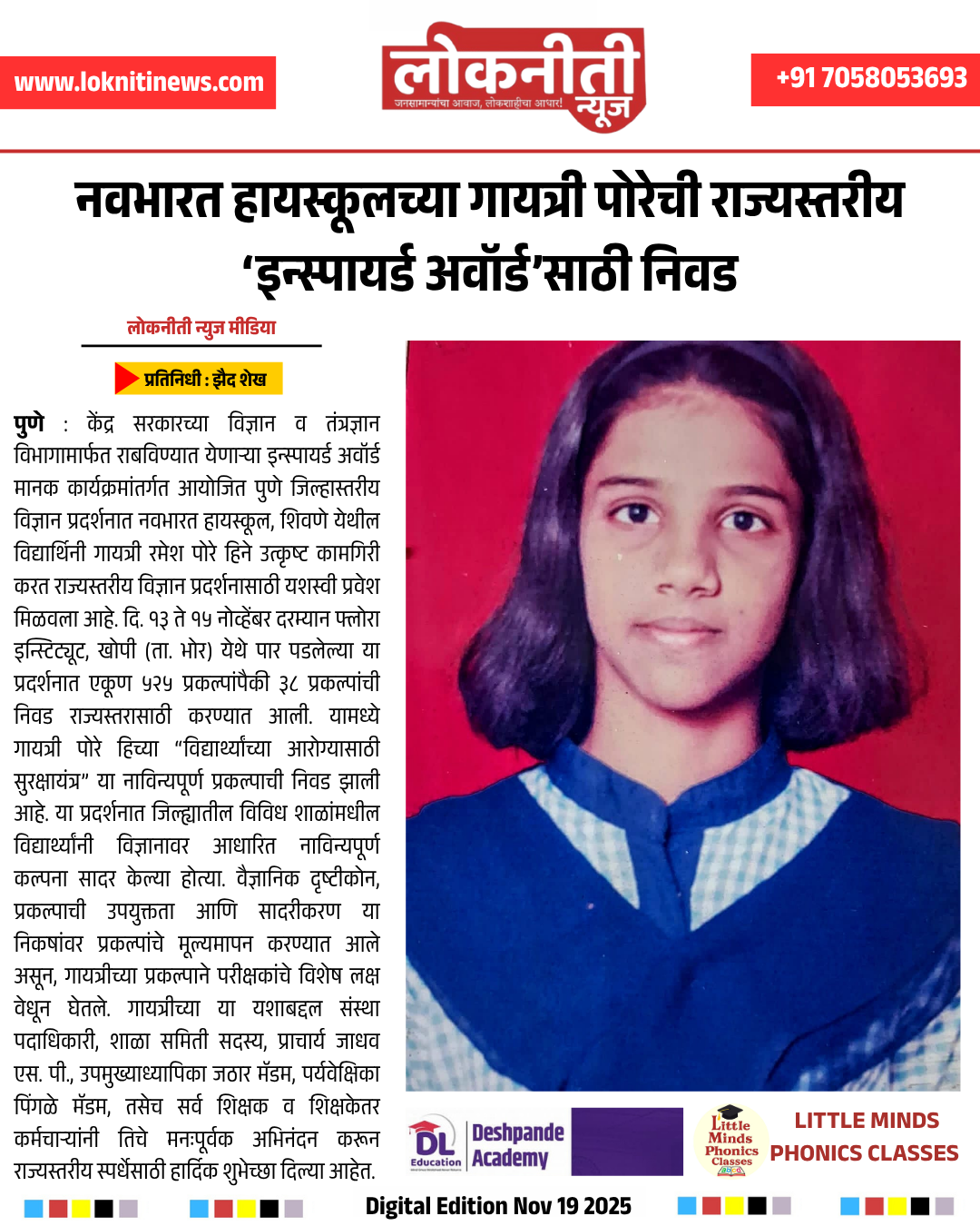 नवभारत हायस्कूलच्या गायत्री पोरेची राज्यस्तरीय ‘इन्स्पायर्ड अवॉर्ड’साठी निवड.
