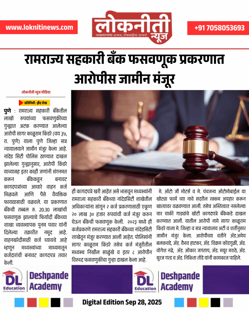 रामराज्य सहकारी बँक फसवणूक प्रकरणात आरोपीस जामीन मंजूर!
