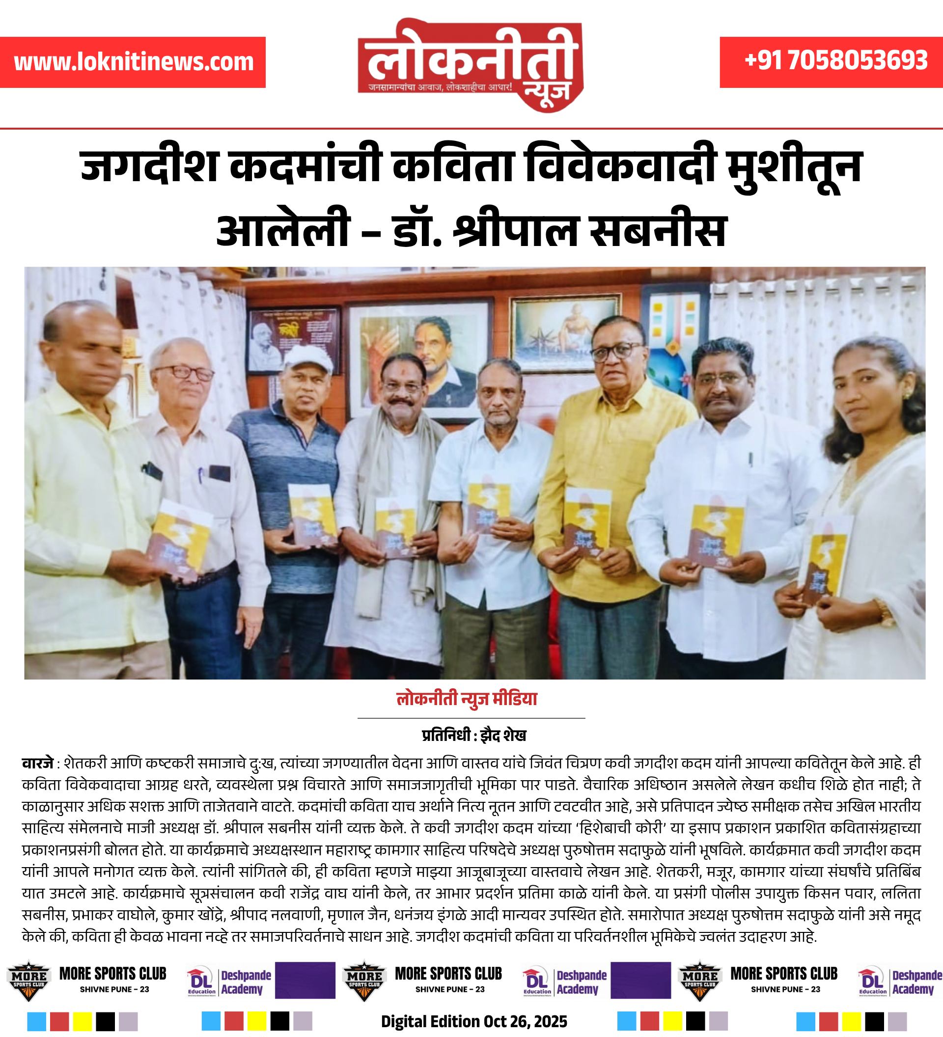 जगदीश कदमांची कविता विवेकवादी मुशीतून आलेली – डॉ. श्रीपाल सबनीस