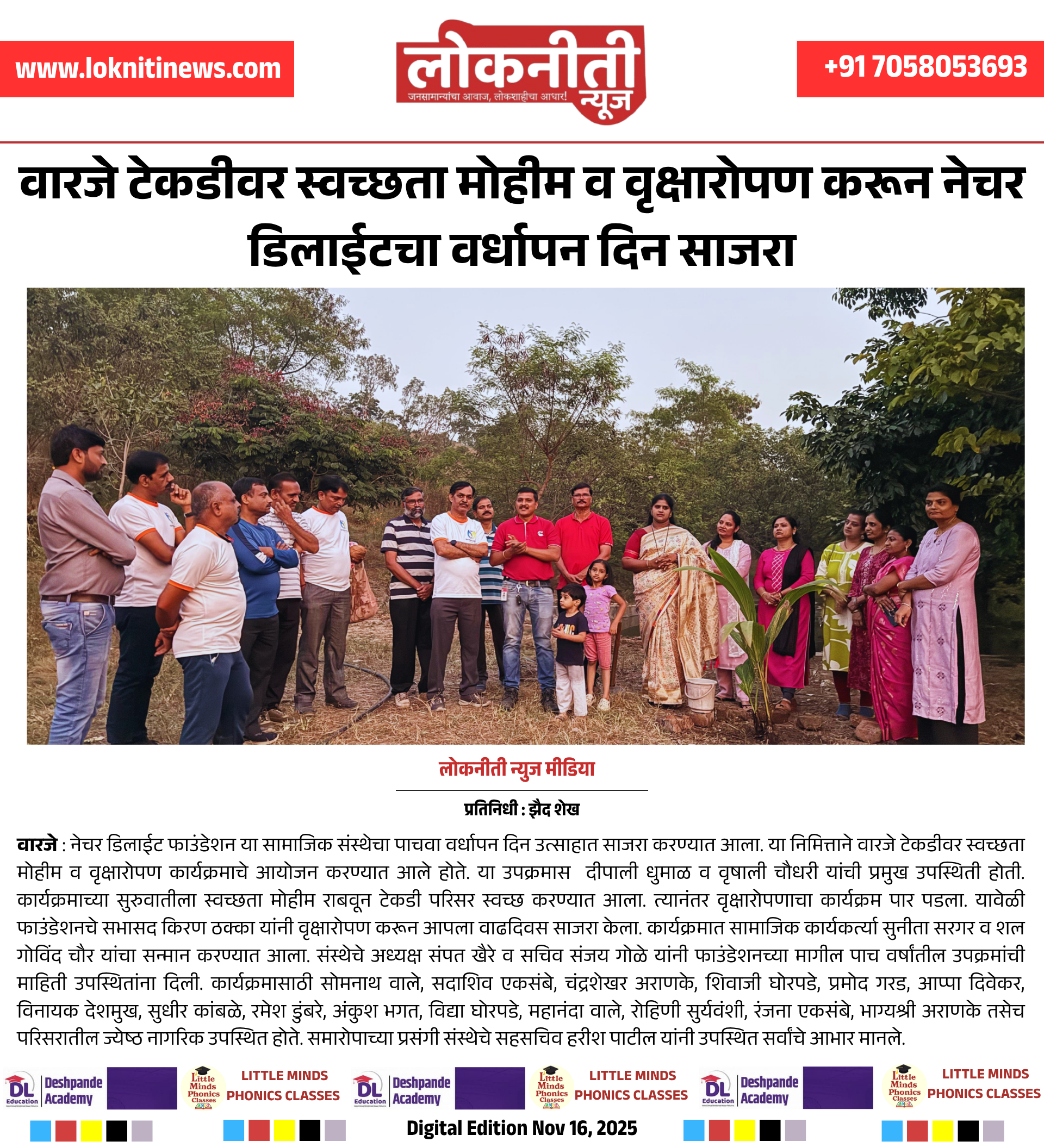 वारजे टेकडीवर स्वच्छता मोहीम व वृक्षारोपण करून नेचर डिलाईटचा वर्धापन दिन साजरा.