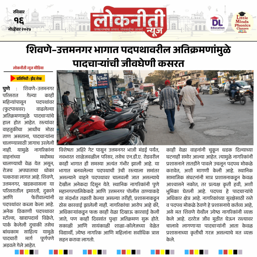 शिवणे–उत्तमनगर भागात पदपथावरील अतिक्रमणांमुळे पादचाऱ्यांची जीवघेणी कसरत.