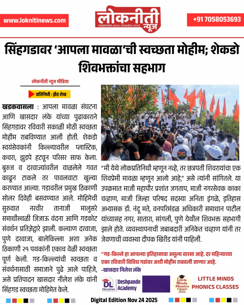 सिंहगडावर ‘आपला मावळा’ची स्वच्छता मोहीम; शेकडो शिवभक्तांचा सहभाग.