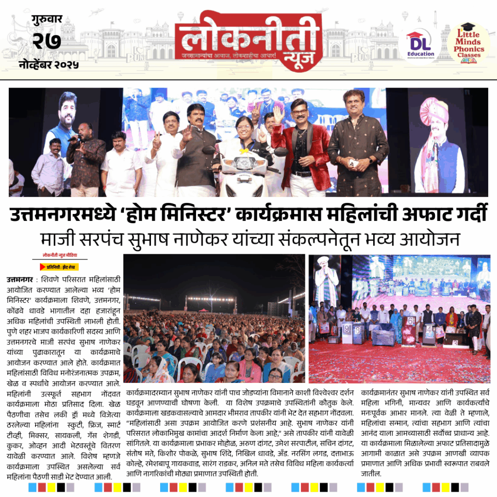 उत्तमनगरमध्ये ‘होम मिनिस्टर’ कार्यक्रमास महिलांची अफाट गर्दीमाजी सरपंच सुभाष नाणेकर यांच्या संकल्पनेतून भव्य आयोजन.