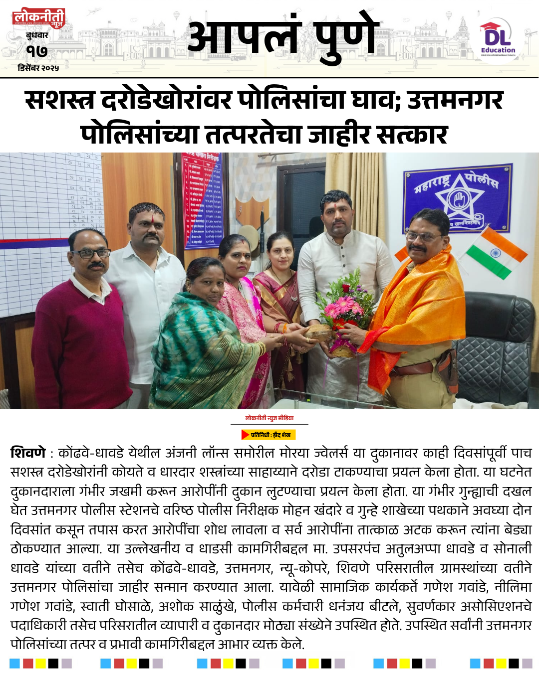सशस्त्र दरोडेखोरांवर पोलिसांचा घाव; उत्तमनगर पोलिसांच्या तत्परतेचा जाहीर सत्कार.