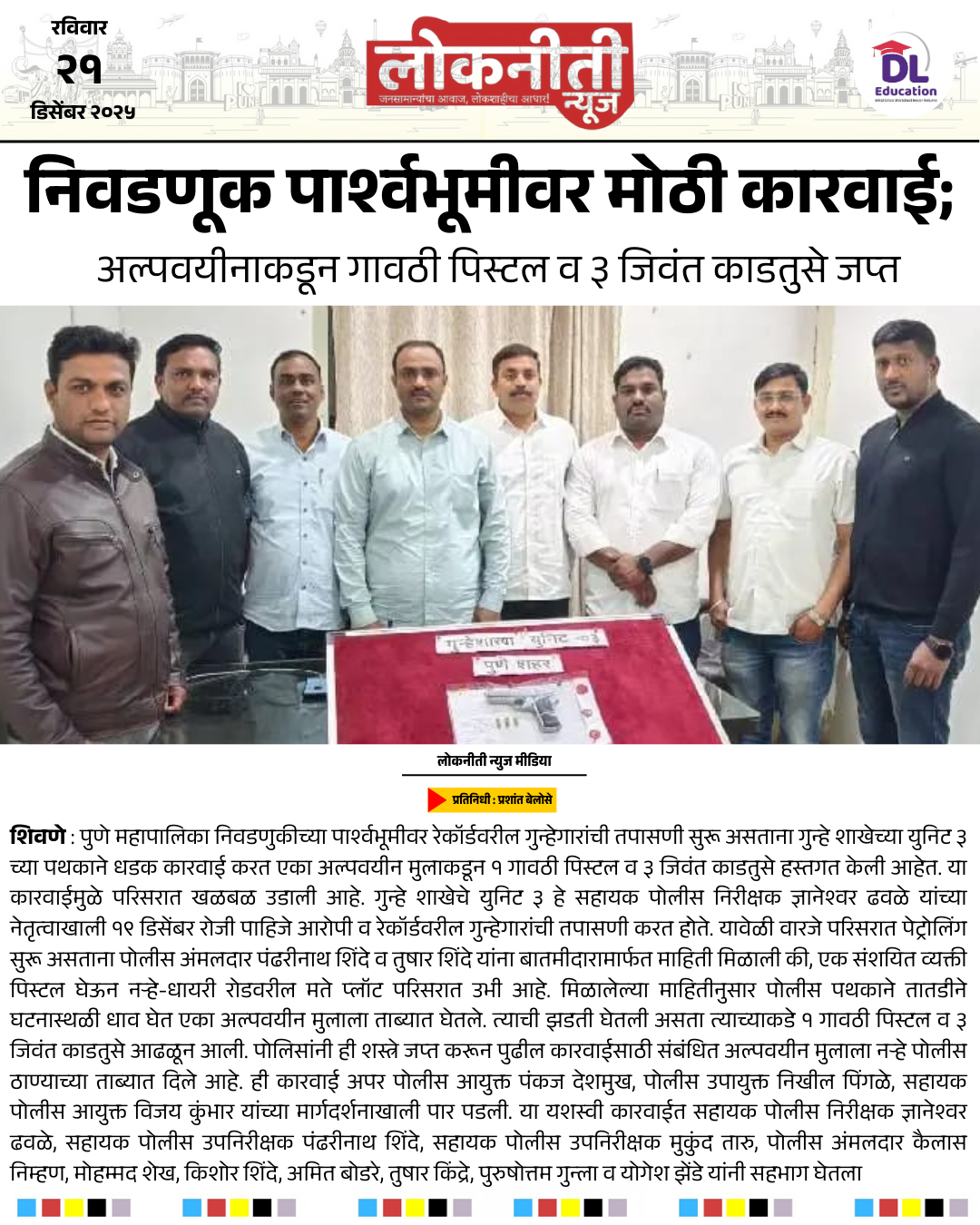 निवडणूक पार्श्वभूमीवर मोठी कारवाई; अल्पवयीनाकडून गावठी पिस्टल व ३ जिवंत काडतुसे जप्त.