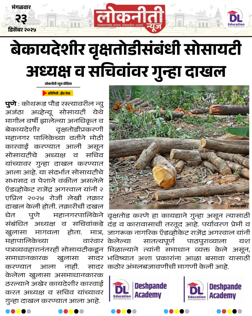 बेकायदेशीर वृक्षतोडीसंबंधी सोसायटी अध्यक्ष व सचिवांवर गुन्हा दाखल.