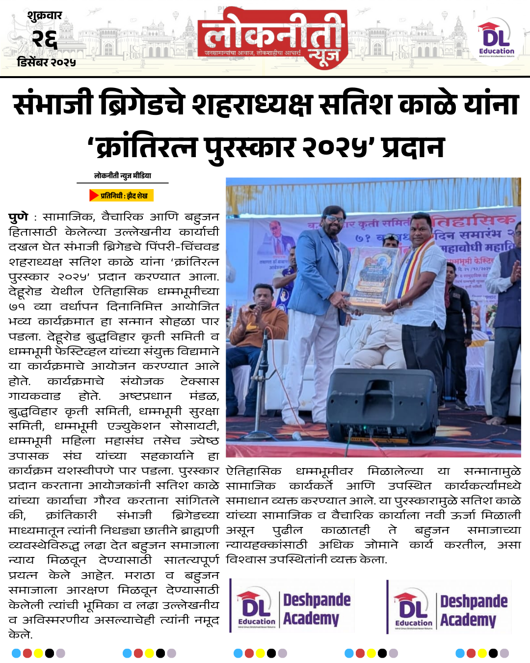 संभाजी ब्रिगेडचे शहराध्यक्ष सतिश काळे यांना ‘क्रांतिरत्न पुरस्कार २०२५’ प्रदान.