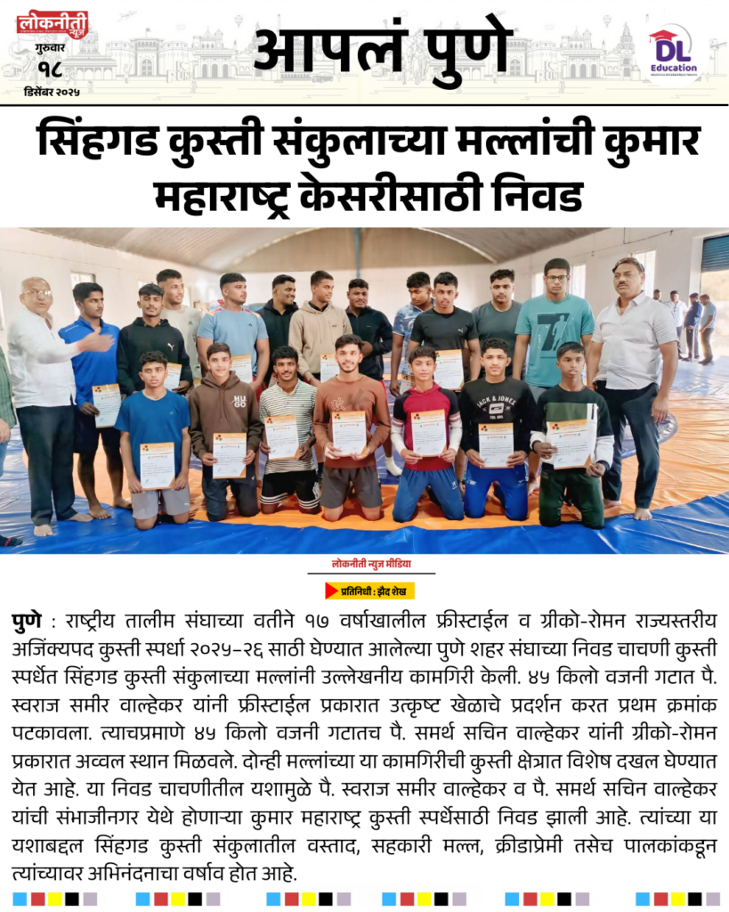 सिंहगड कुस्ती संकुलाच्या मल्लांची कुमार महाराष्ट्र केसरीसाठी निवड.