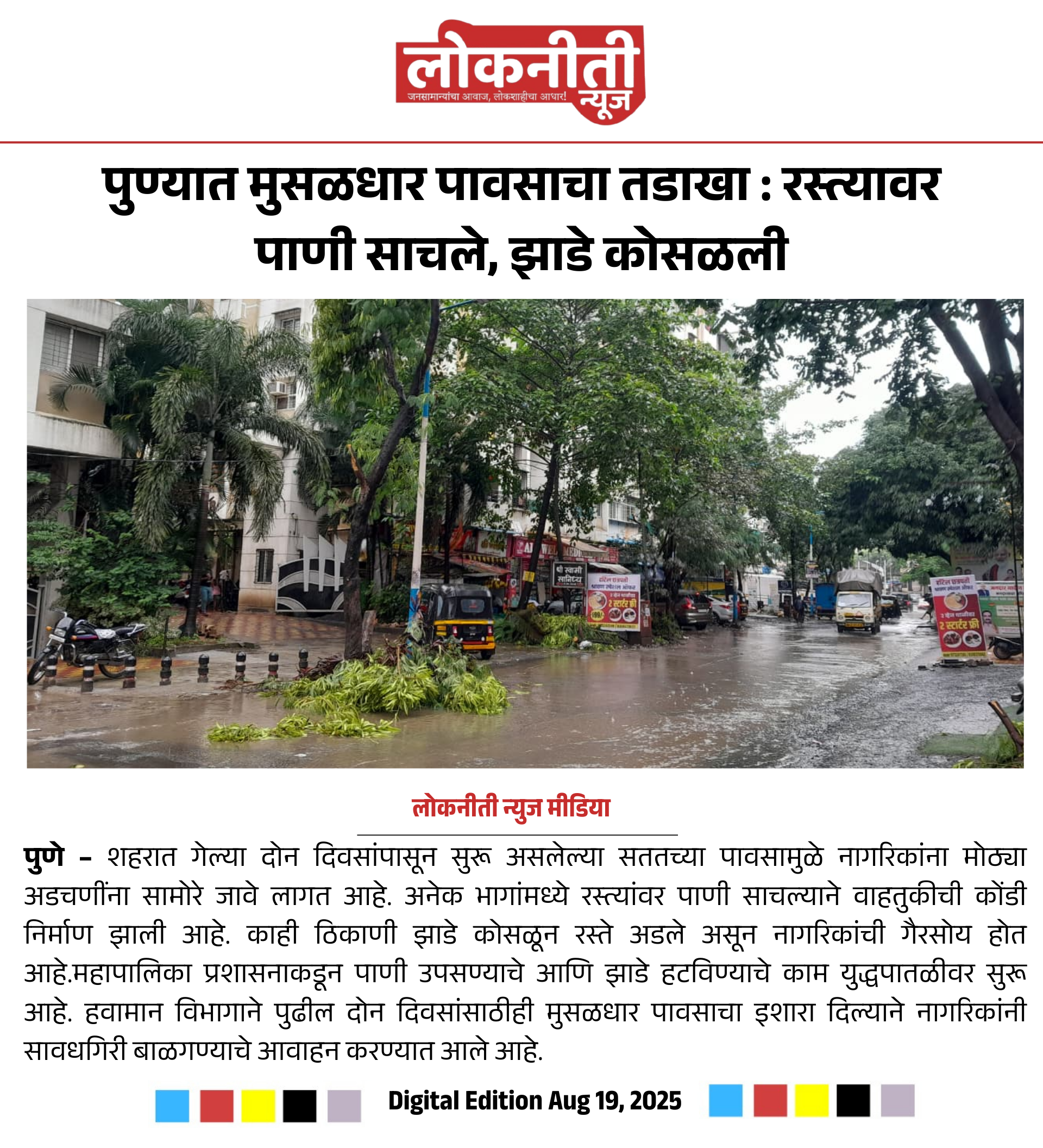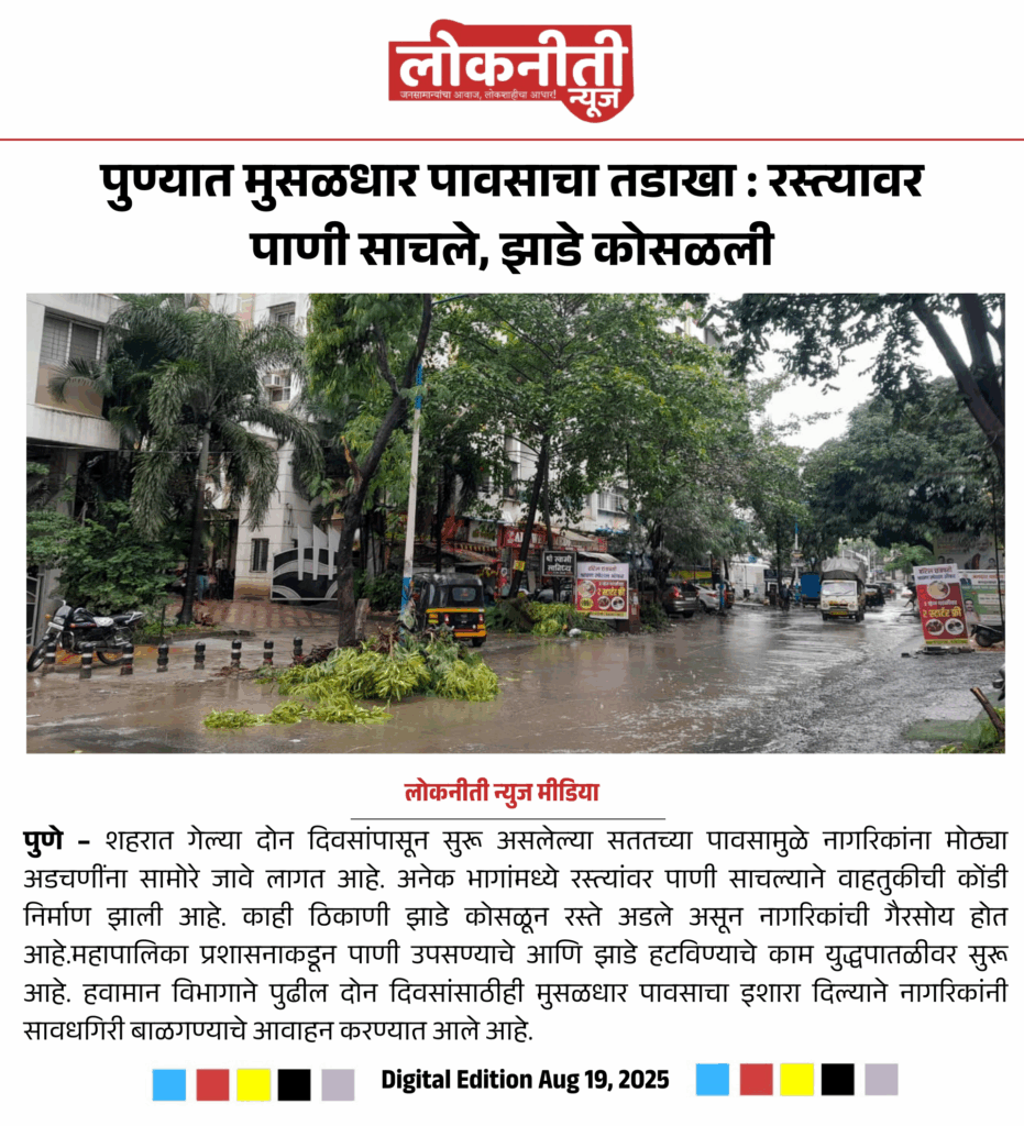 पुण्यात मुसळधार पावसाचा तडाखा : रस्त्यावर पाणी साचले, झाडे कोसळली.