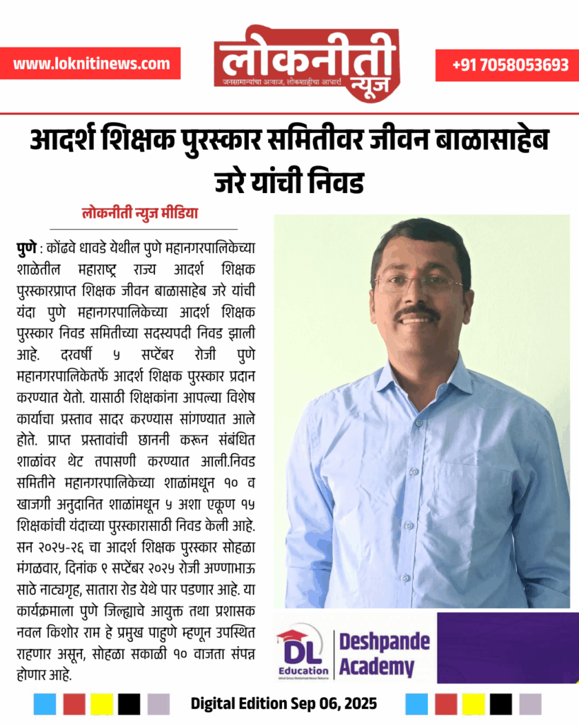 आदर्श शिक्षक पुरस्कार समितीवर जीवन बाळासाहेब जरे यांची निवड.